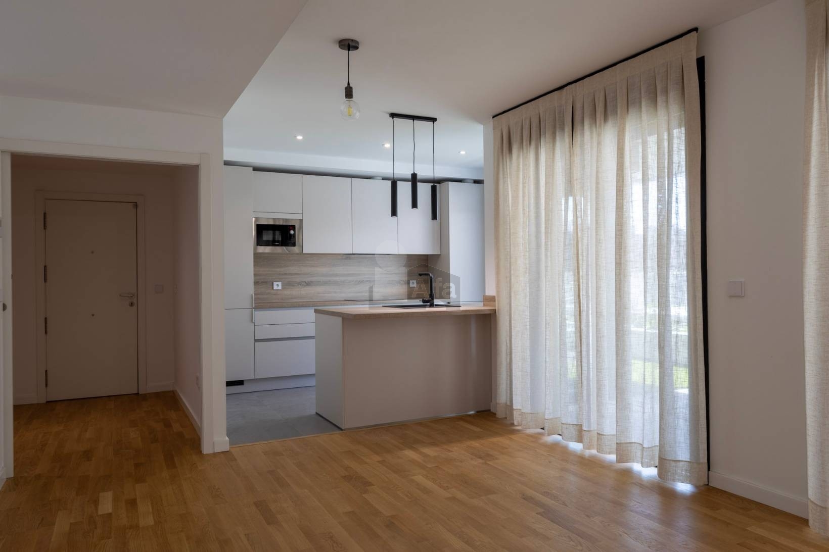 Este hogar cuenta con dos dormitorios muy luminosos, uno de ellos en suite, y dos baños modernos que garantizan la máxima comodidad. Además, dispone de una habitación adicional que puede adaptarse a tus necesidades: ya sea como despacho, vestidor o trastero. La calidad de los acabados es excepcional, con suelos de madera de roble y carpinterías de aluminio Strugal Infinity que aportan un toque elegante y persianas motorizadas.
